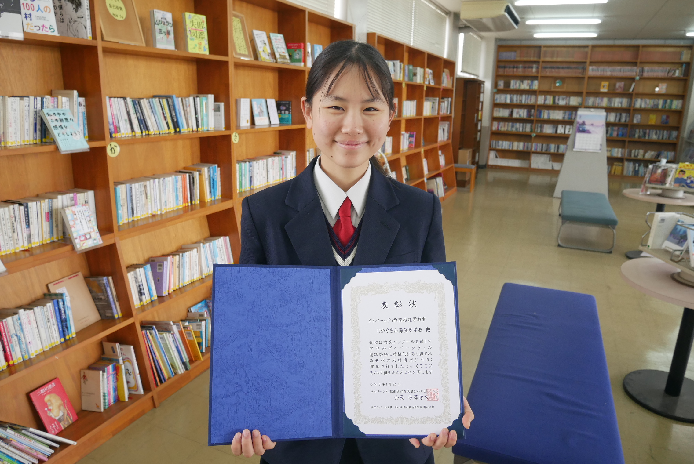 その中の一つ、『子から親へのエール論文』。仕事や家庭で頑張っている親へ今だから言えるありがとうを伝えるための論文コンクールに、自ら「書きたい!」と言って、積極的にチャレンジしてくれた難波紗矢さん。吹奏楽部とスピーチ部を兼部しているので忙しいはずなのに、両親への感謝の想いを書き上げてくれました。そして結果は、「ダイバーシティ教育推進学校賞」をいただくことができました。