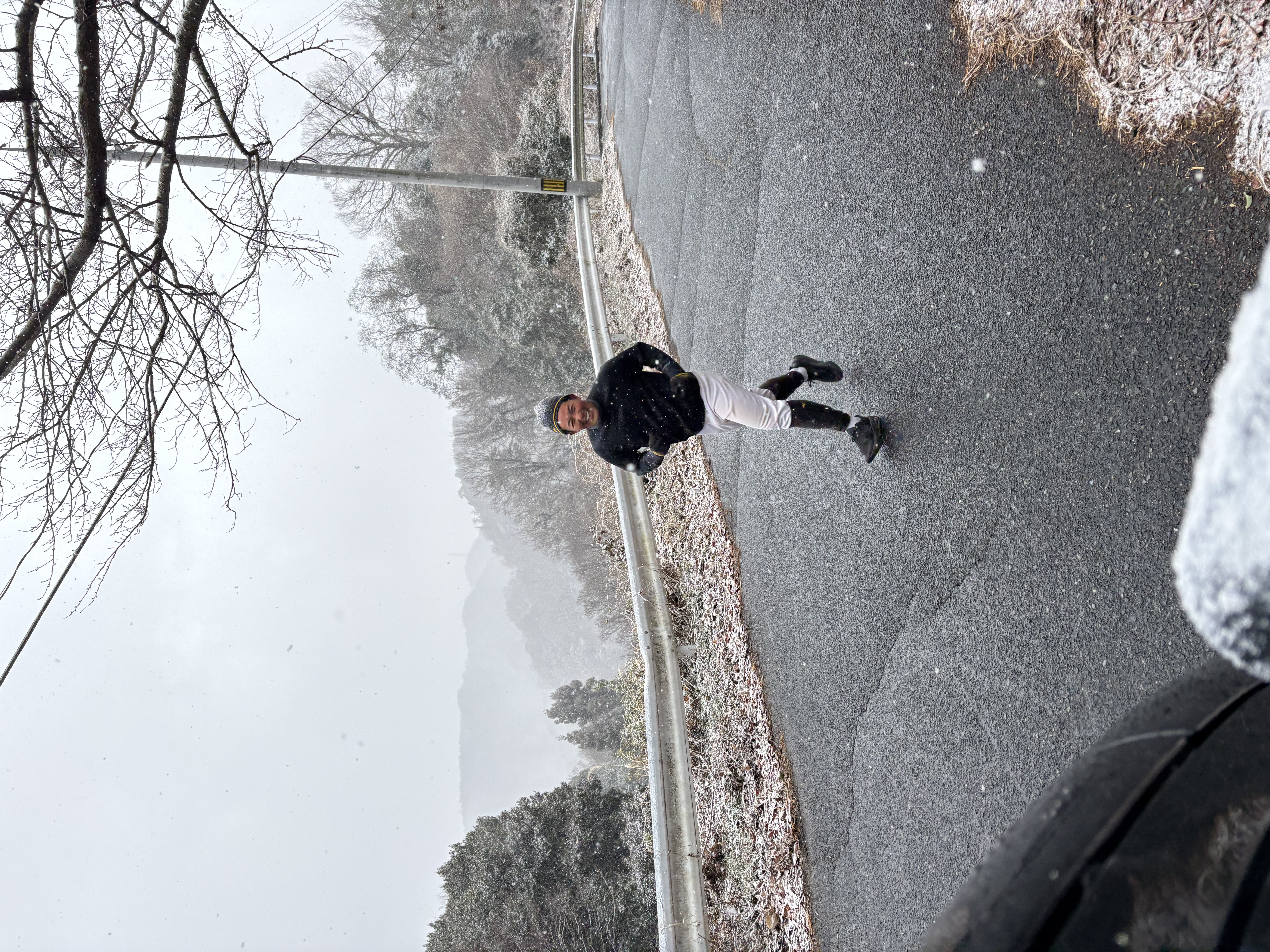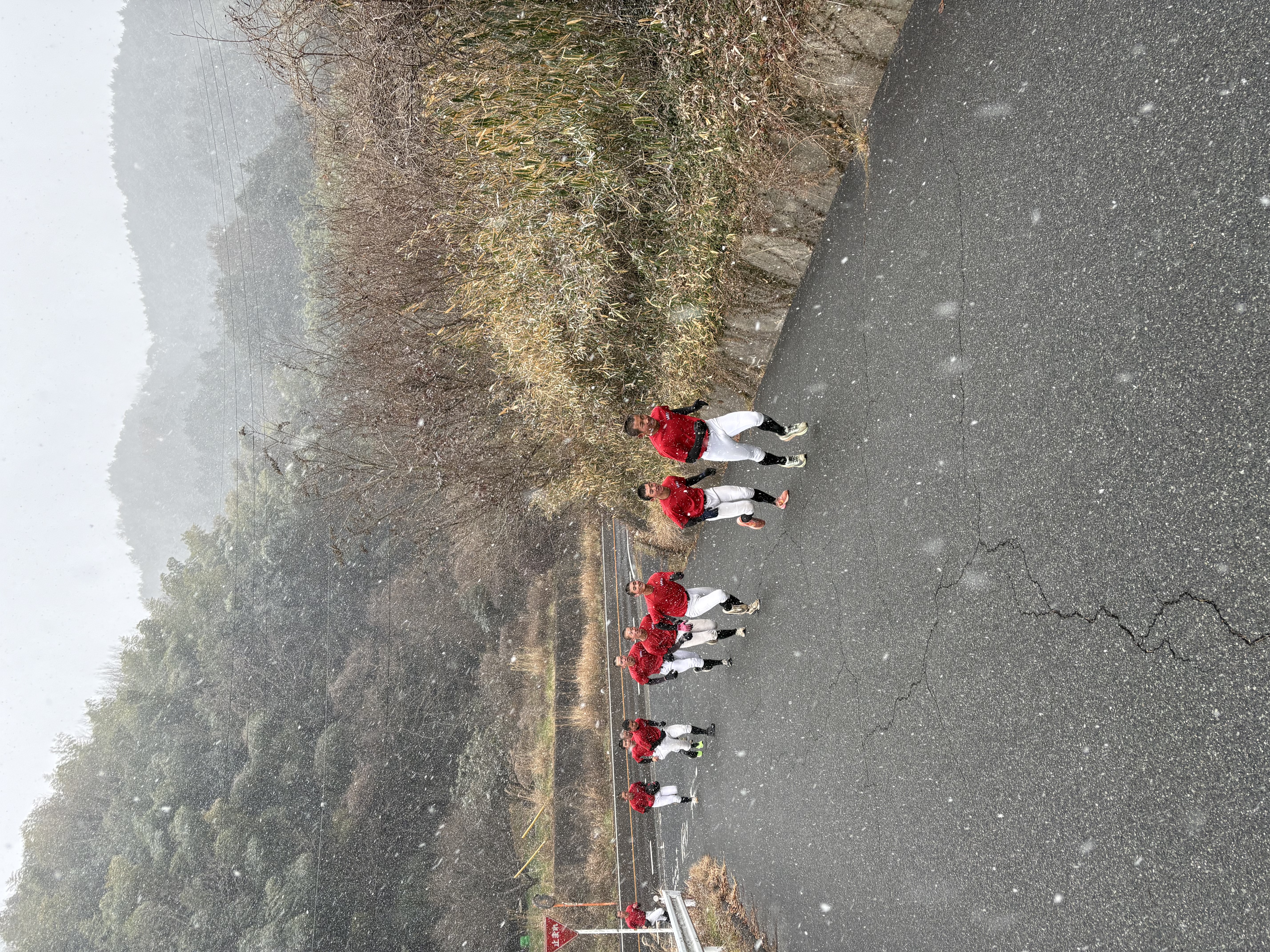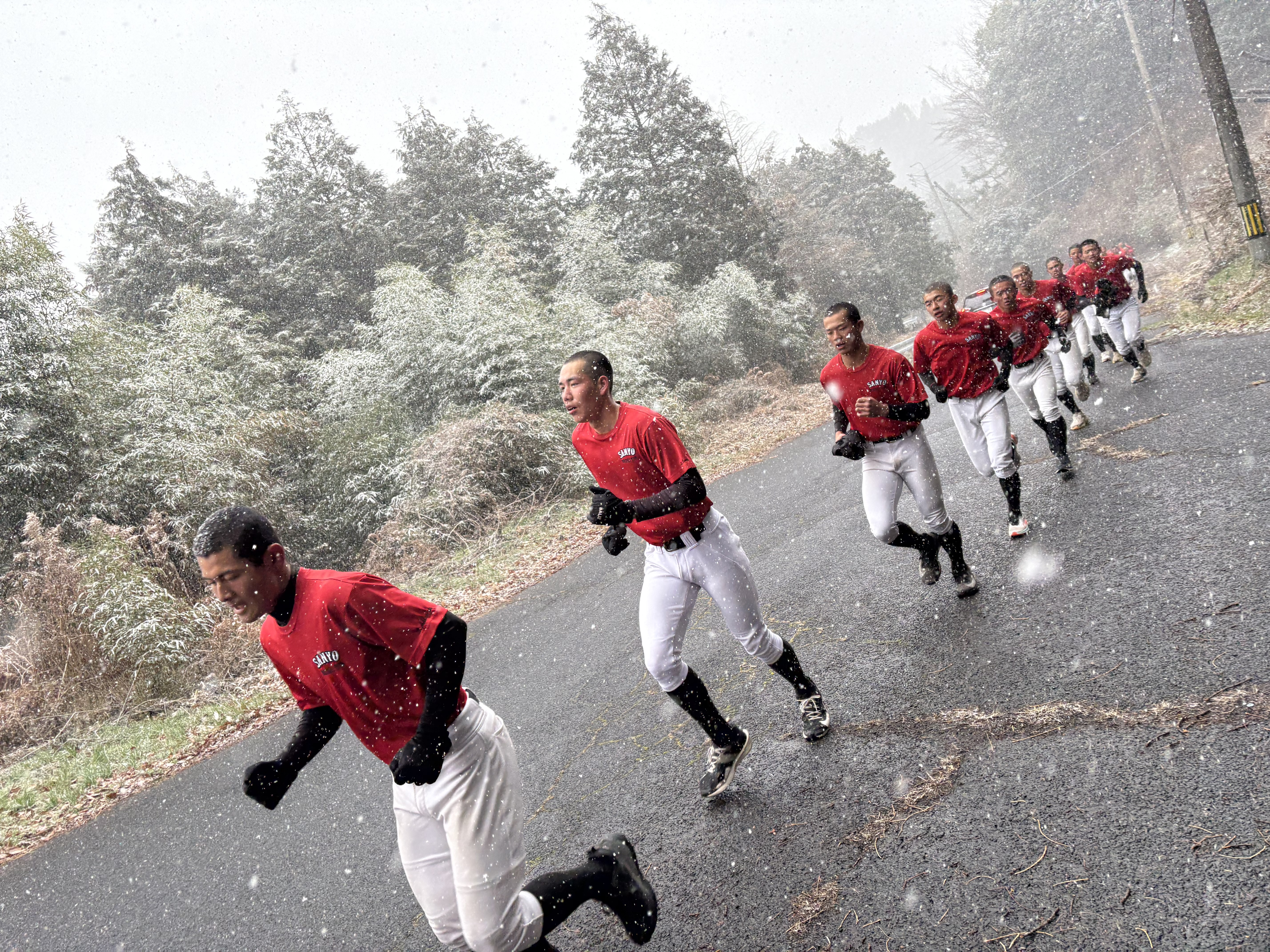 OBとの交流の後、気温がどんどん下がり日本海側では大雪。瀬戸内のグラウンドにも雪が降り出しました。とても野球の練習する状態ではありません。一年に一回あるかないかの伝説のメニュー“山”が発動されました。遥照山を登ります。片道7キロですが、きつい!帰りは膝がガクガク🤭 小寺・中山コーチは、山の後のメニューを提案してきました。無理無理…山の後、何もしたくないやろと一蹴。小寺コーチが“山”に参戦。山頂からは、中山コーチの車で戻ってました。グラウンドに戻ってきてから、練習する?と聞くと「無理ッス😅 高校生すげ〜わ」と言ってました。