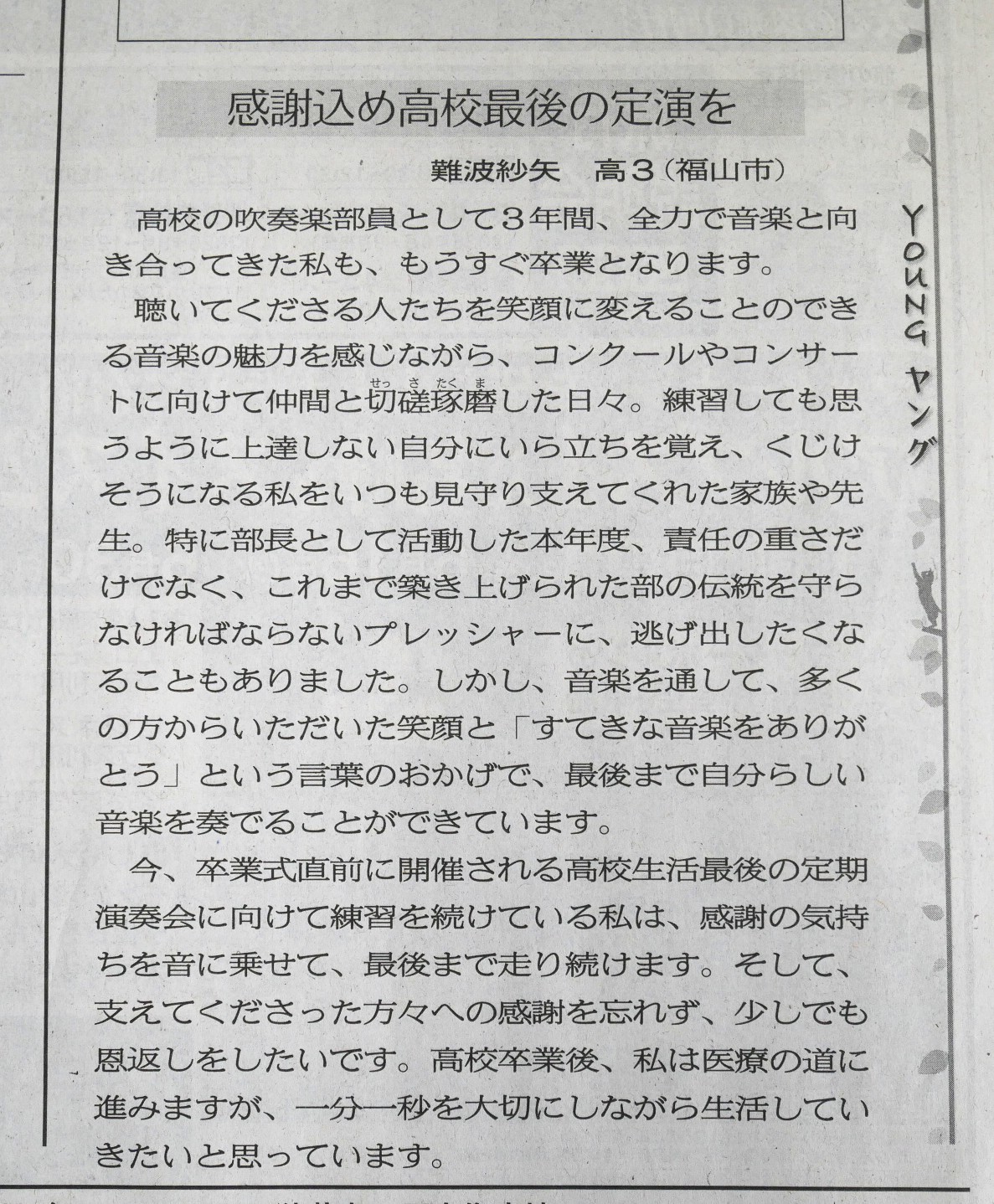 今朝の山陽新聞ちまた欄に原稿が掲載されたのは、3年生の難波紗矢さん。吹奏楽部員として全力で音楽と向き合ってきた3年間の想い、高校生活最後となる定期演奏会に向けた素直な想い、そして、感謝の想いをしっかり言葉にしてくれています。吹奏楽部でも、スピーチ部でも、いつも全力で頑張る紗矢さんの最後の演奏会にかける想いがよく伝わってくる文章になっています。