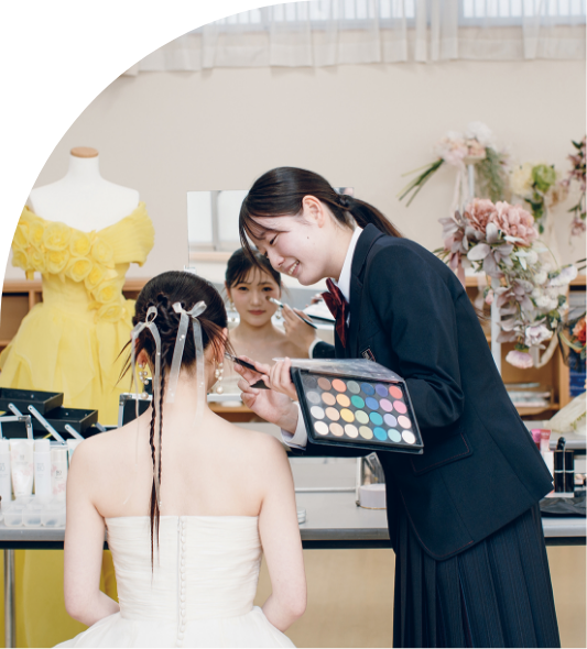 「好き!」を叶えるためにどうすればいいのか、将来へ繋げるための土壌を育てる環境がビューティコースにはあります。美容で大切なのは、技術よりまず人の心に寄り添うこと。同じ想いをもった仲間との交流やプロから教わる実習を通して、「思いやる心」を育てます。将来に繋がる多種多様な資格取得にも挑戦し、就職にも進学にも対応しています。