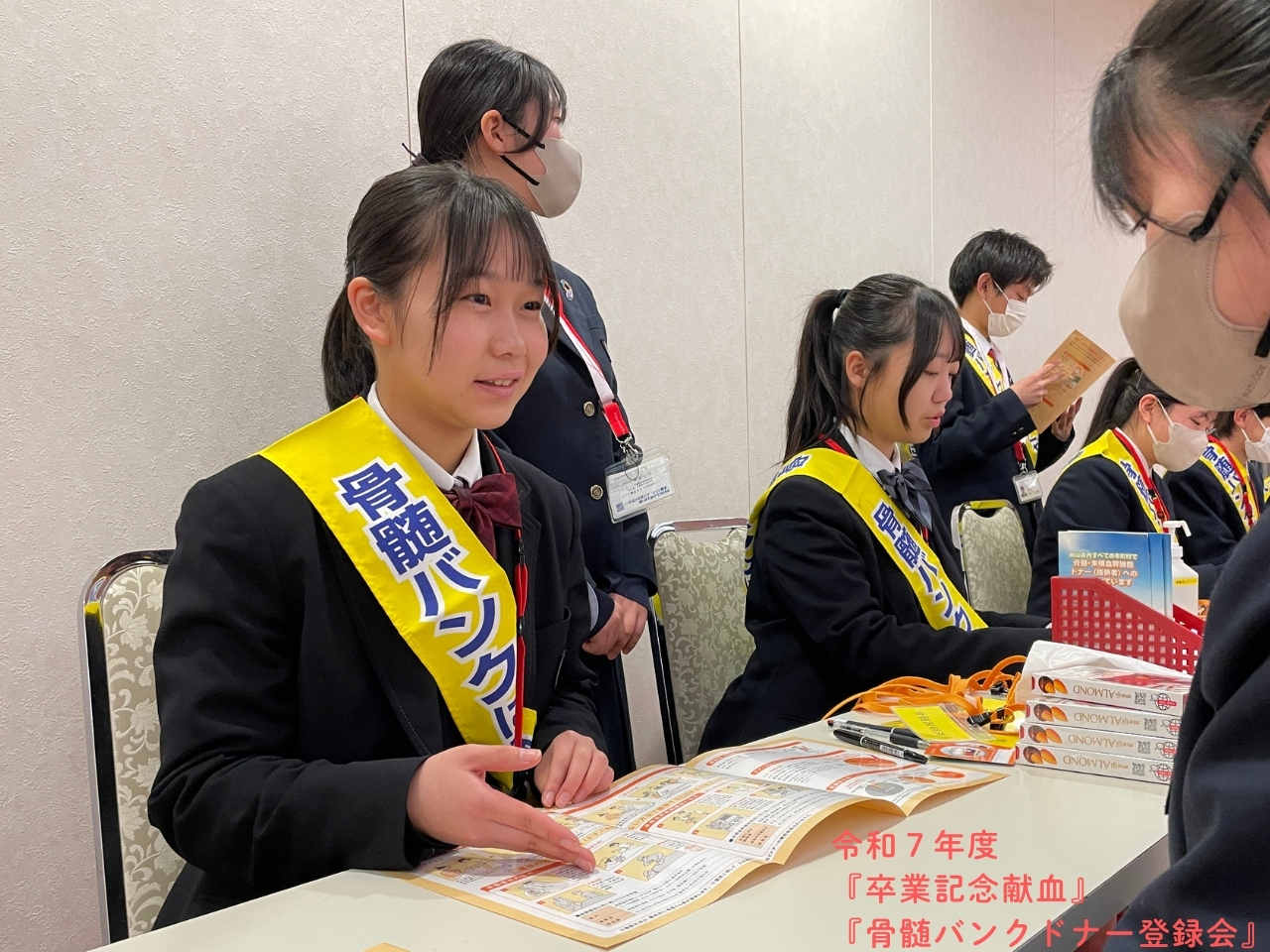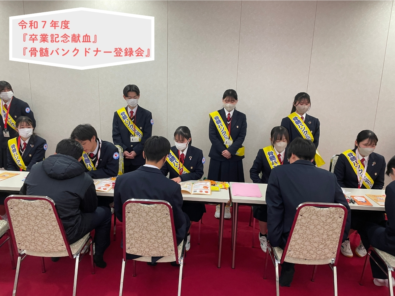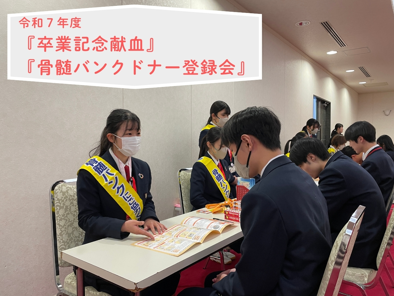 『第44回卒業記念献血』『第14回骨髄バンクドナー登録会』が実施されました。自校で開催される献血において、高校生が骨髄バンクドナー登録について説明を行う全国でも初めての取り組みも、今年度で3回目となりました。「公益財団法人日本骨髄バンク説明員」の資格を取得したユネスコ部(普通科特別進学コース)の生徒17名が説明員として参加しました。3年生の部員は「今年は18歳になったので、自分も登録できる!」と、自らもドナー登録や献血に参加してくれました。私たちの取り組みが全国の高校生に広まることを願っています。皆様も献血・骨髄バンクドナー登録へのご協力をお願いします。