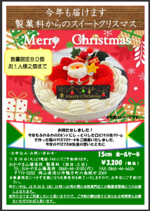 商品は12月24日(水)10:00~16:00におかやま山陽高校東門近くの製菓実習棟にて料金と引き換えでのお受け渡しとなります。