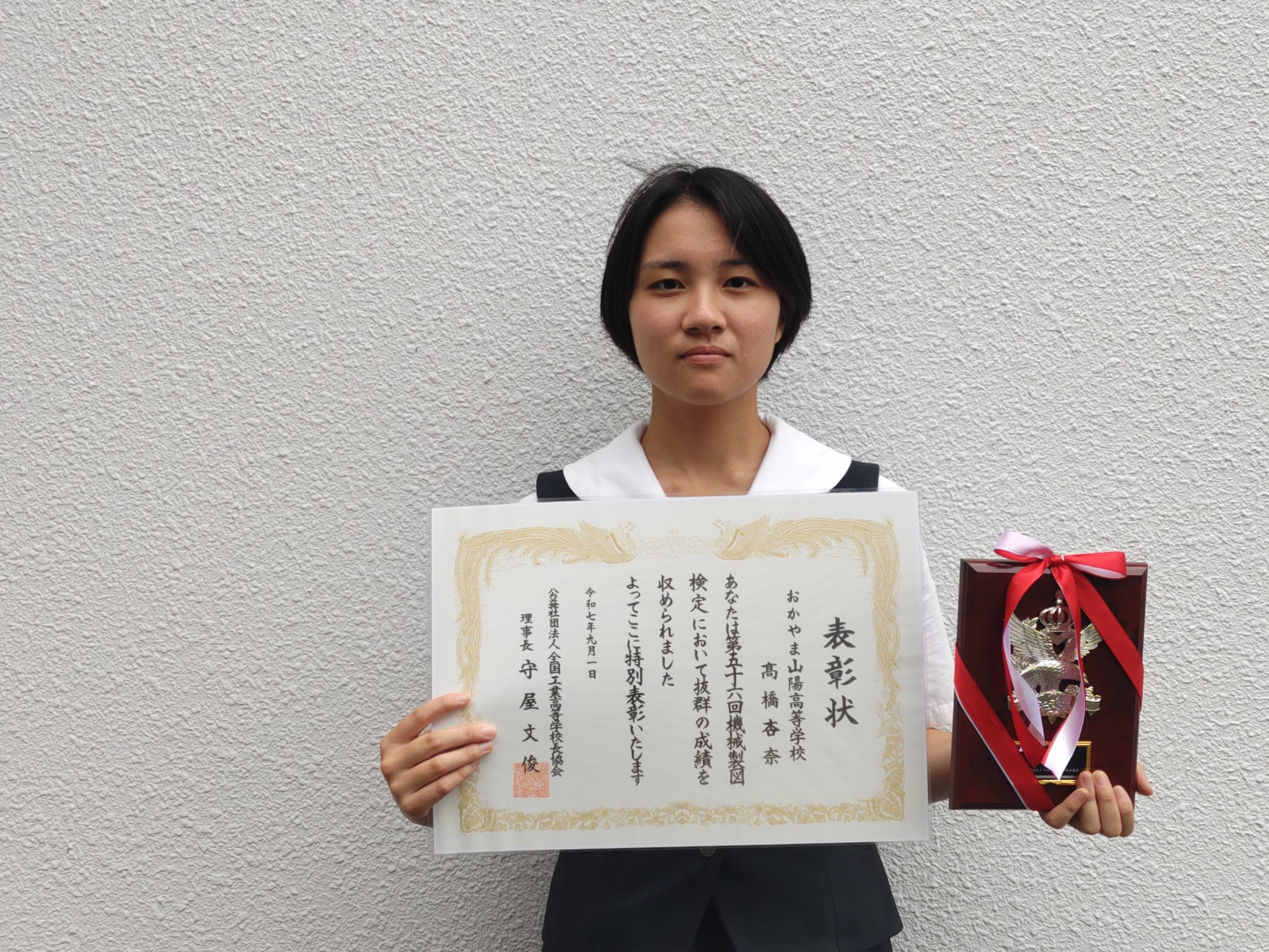 過日行われた機械製図検定において、特に優秀な生徒を対象とする特別表彰を機械科3年生の喜田瑞貴さん(神辺中学校出身)、髙橋杏奈さん(金光中学校出身)の2名が受賞しました。両名とも素晴らしい図面を制作しましたが、僅かな差で喜田さんが第1位、髙橋さんが第2位となりました。